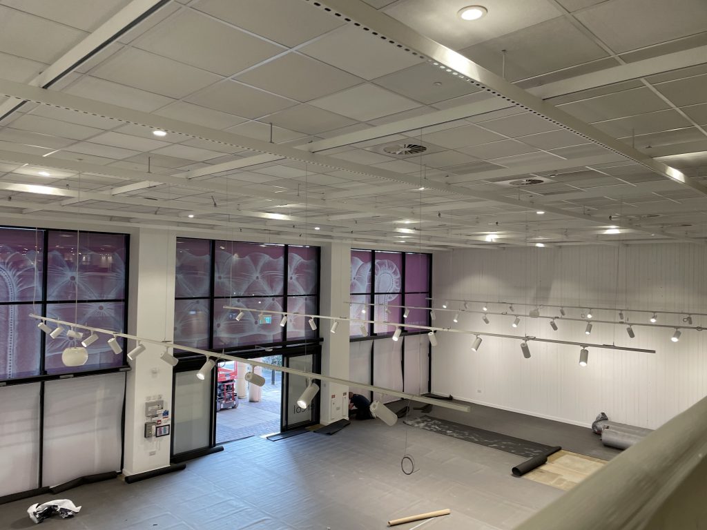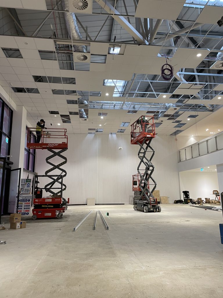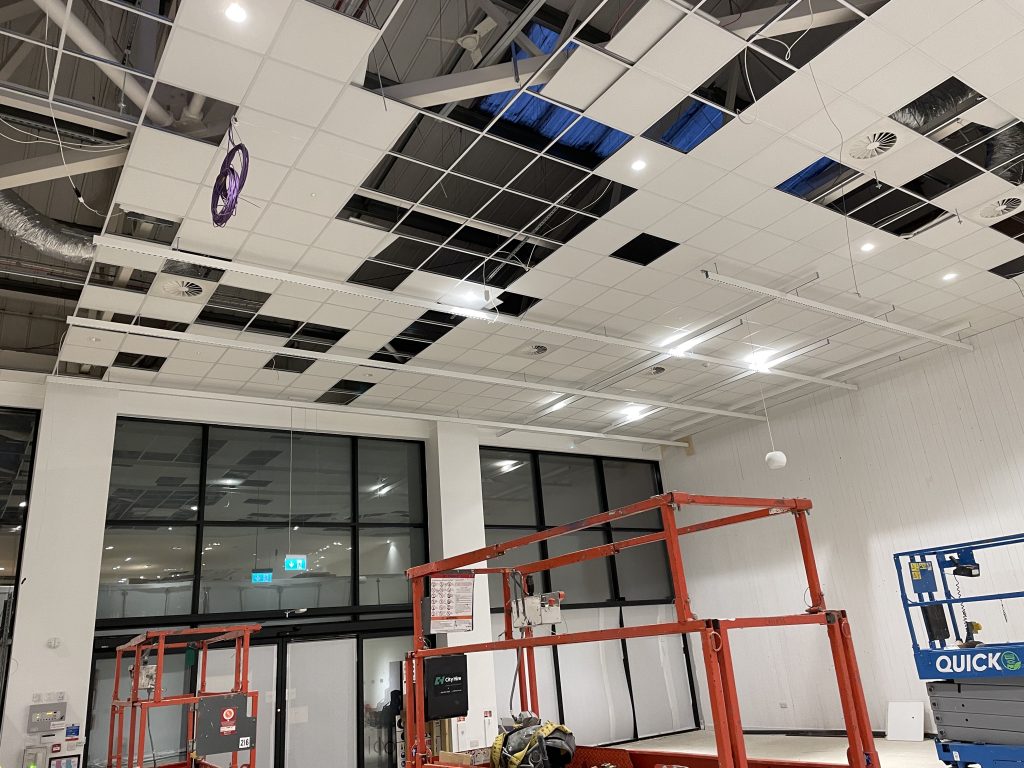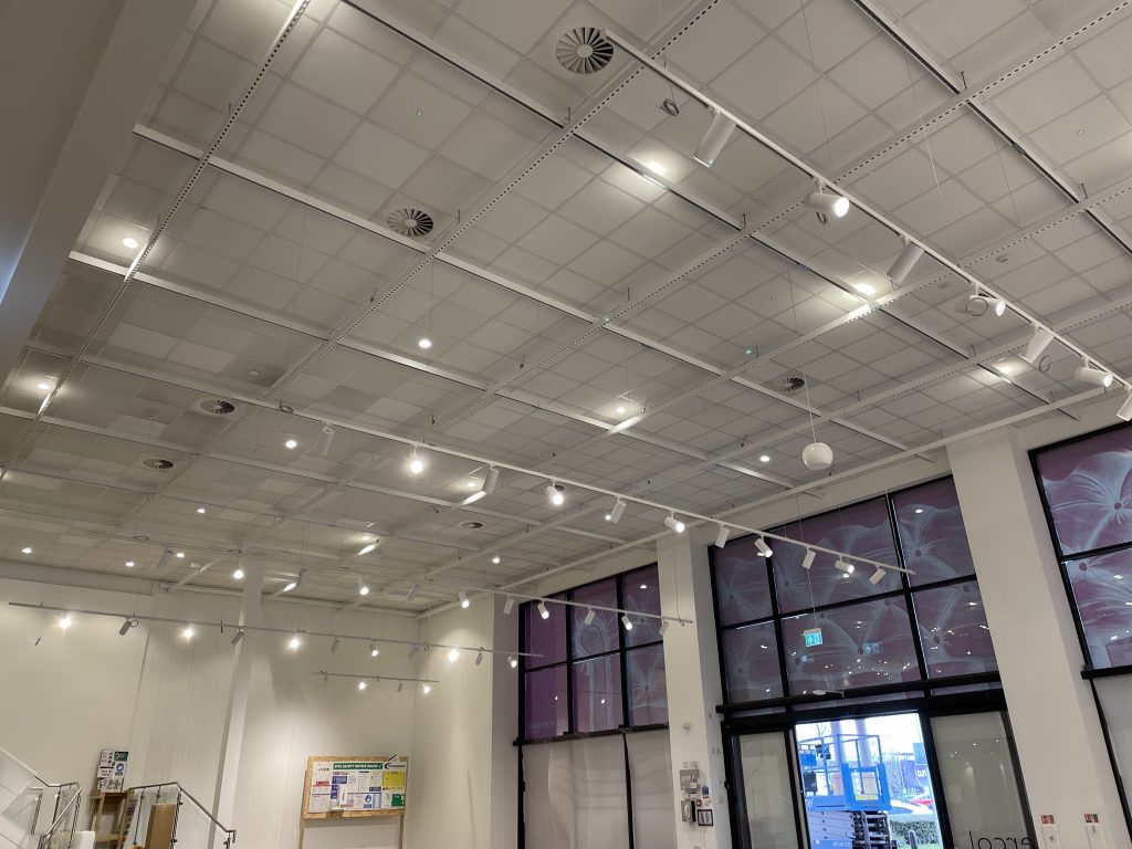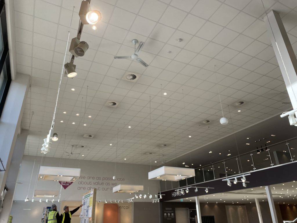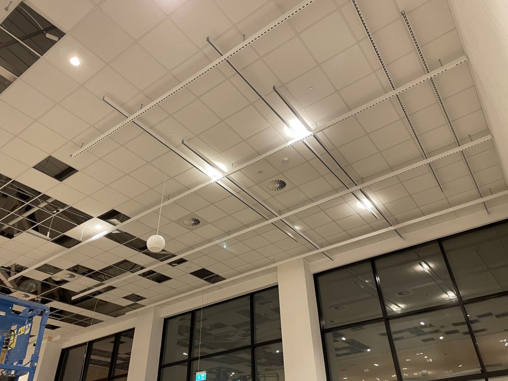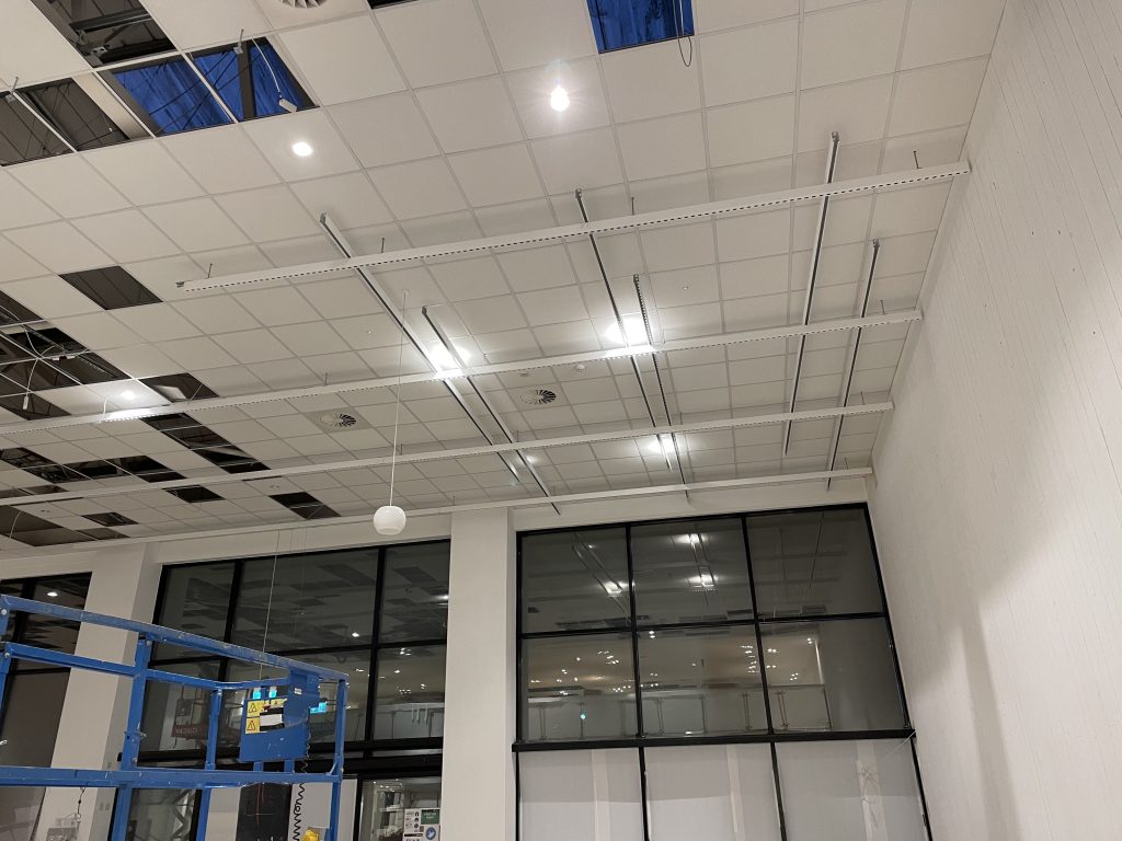 Unistrut sub grid required to take all the services and hang mannequins up to 180 kg. Removal of existing ceiling and work above in order to access sufficient fixing points for the system. Very tight and careful work.